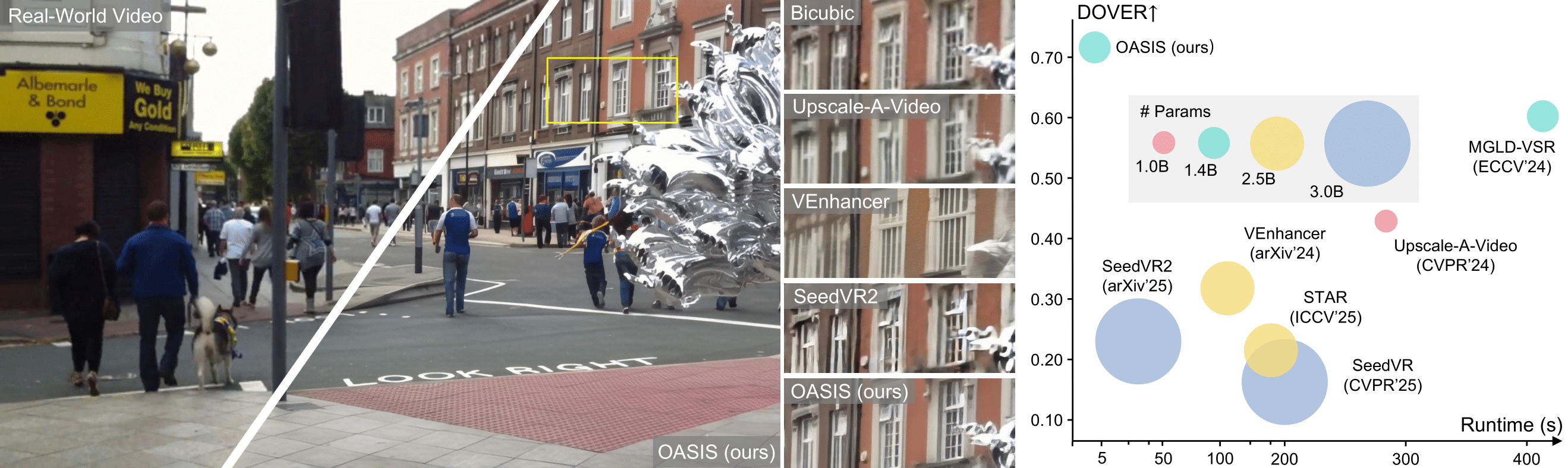 OASIS incorporates an attention specialization routine (ASR) to mitigate redundancy while improving performance. Given an input low-resolution video, we first map it into the latent space via pixel-unshuffle, and then process it with a diffusion transformer equipped with ASR. ASR divides attention heads into global, intra-frame, and window groups to capture complementary contexts, with grouping based on the KL-divergence between their localized and global attention distributions. Their outputs are concatenated into an aggregated feature, and a VAE decoder reconstructs the video from the restored latent.